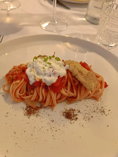 Paccheri avvolti da un sugo intenso di scorfano, profumato e armonioso, che esalta la struttura della pasta e la nobiltà del pesce.