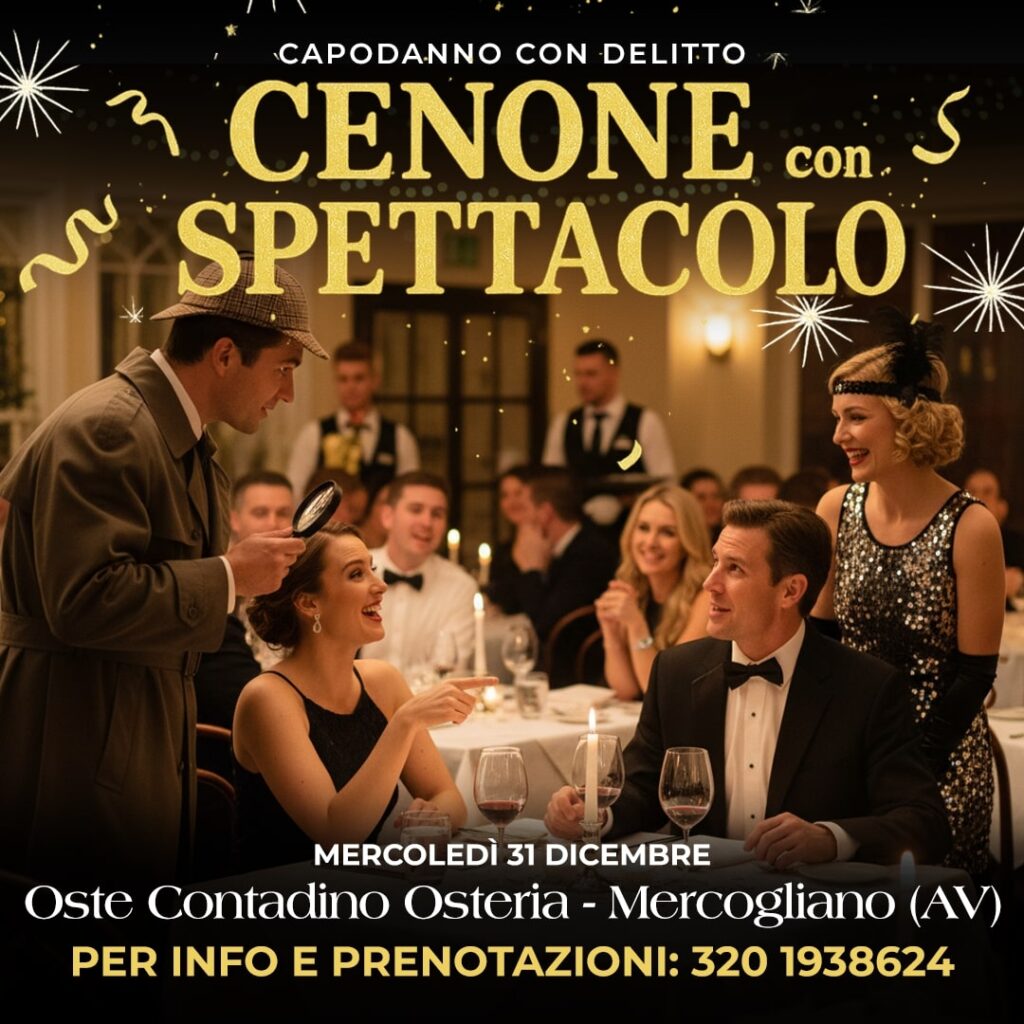Durante il Gran Cenone, attori professionisti, indizi e colpi di scena trasformano ogni portata in un pezzo dell’indagine. Tra brindisi, suspense e risate, vivi una serata elegante e coinvolgente… dove il colpevole potresti scoprirlo proprio tu.