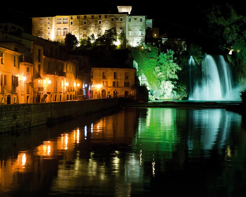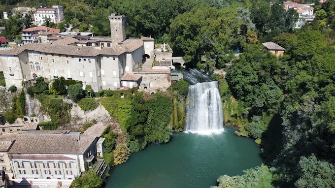 Esso sorge su un masso di travertino che sbarrando il corso al fiume Liri lo costringe a dividersi in due rami e a formare le famose cascate, la più nota Cascata Verticale a sud e la non meno suggestiva Cascata del Valcatoio o Cascatelle ad ovest; entrambe alte 27 metri ed aventi la particolarità di essere le uniche al mondo a precipitare in un centro abitato.