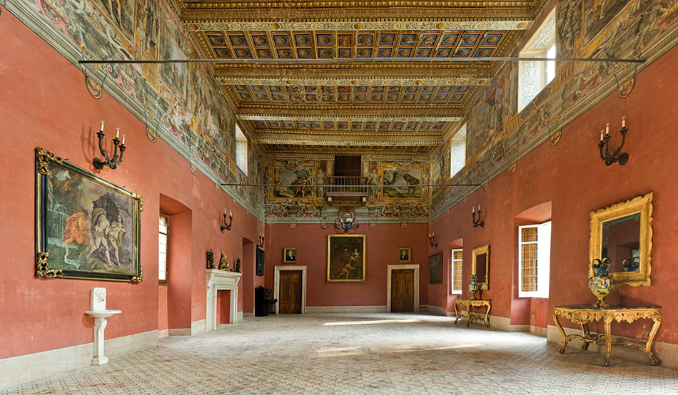Così come i nomi dei Duchi furono iscritti sui portali, gli stemmi delle diverse famiglie imparentate trovano ospitalità nelle fasce decorative e negli stucchi che ornano il piano nobile del Castello.Troviamo quindi i leoni rampanti al ramo di cotogno degli Sforza, le scarpette a scacchi degli Zapata, lo scudo dentato dei Ruffo, l’aquila e il leone dei Gallio, nonché tutte le imprese di casa Boncompagni.